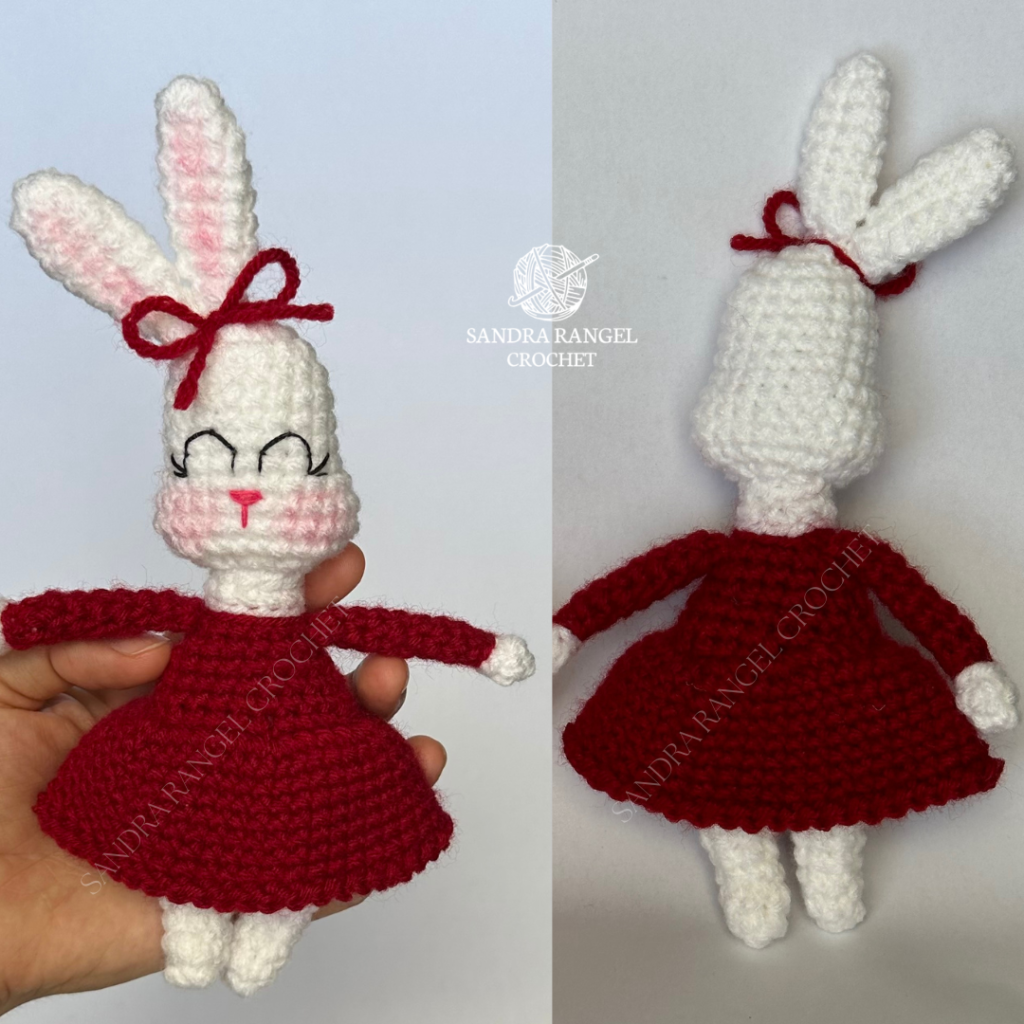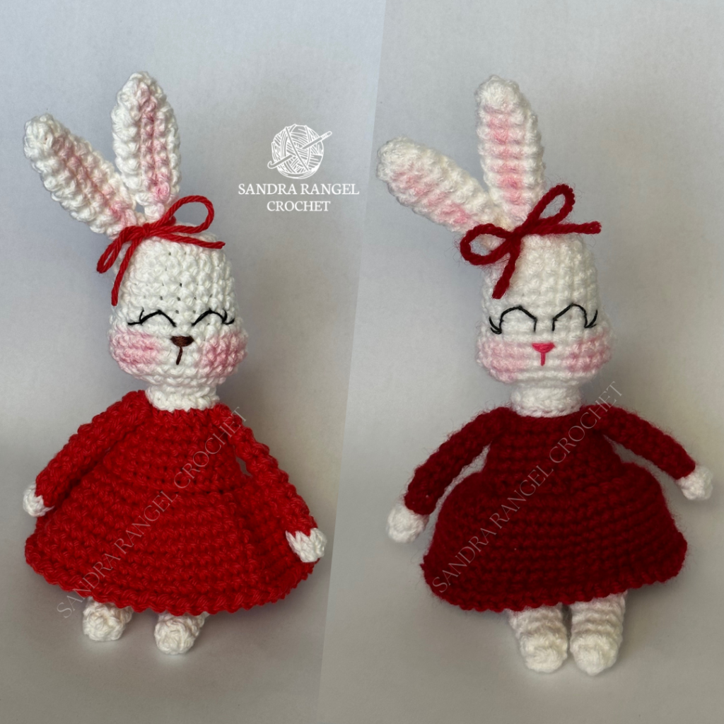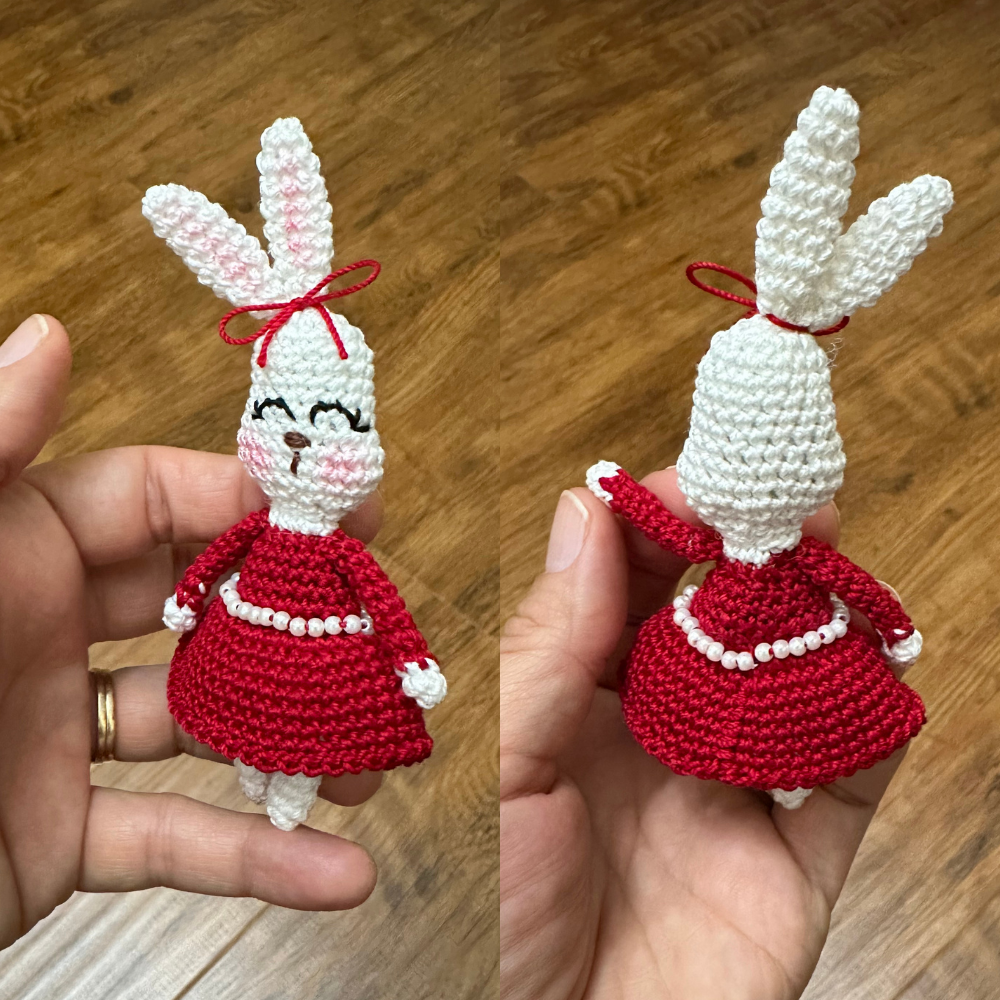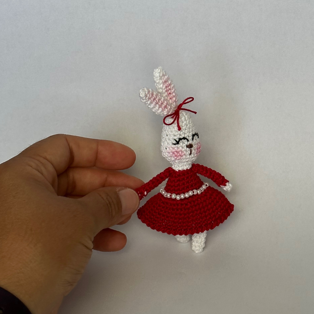 Para la primera conejita, elegí el hilo mercerizado Red Heart Classic, una opción delgada pero resistente que requería un gancho delicado de 1.50 mm. Trabajé su cuerpo en blanco puro y el vestido de un rojo vivo que destacó con un contraste vibrante. Este vestido se integra al cuerpo durante el tejido, lo que le da un aspecto elegante y uniforme. Además, le agregué un cinturón de perlas para darle un toque único. Esta pequeña es del tamaño perfecto para un llavero, un adorno para el espejo del coche, o incluso como broche, tal como sugiere la creadora original en su patrón.