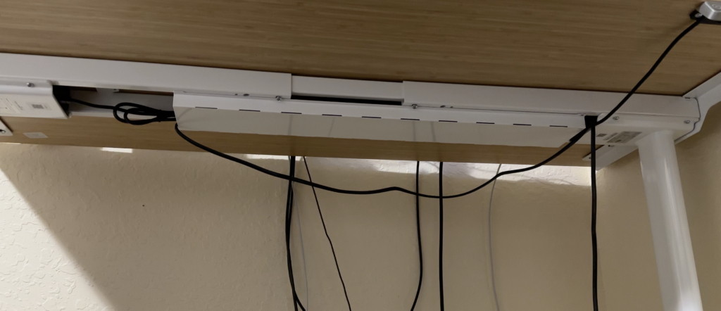 Under the bamboo desktop, there is a built‑in space designed for cable management. It helps keep the desk looking cleaner and more organized. In my case, I still have some cables visible, but the system is there and works very well if you decide to use it fully.