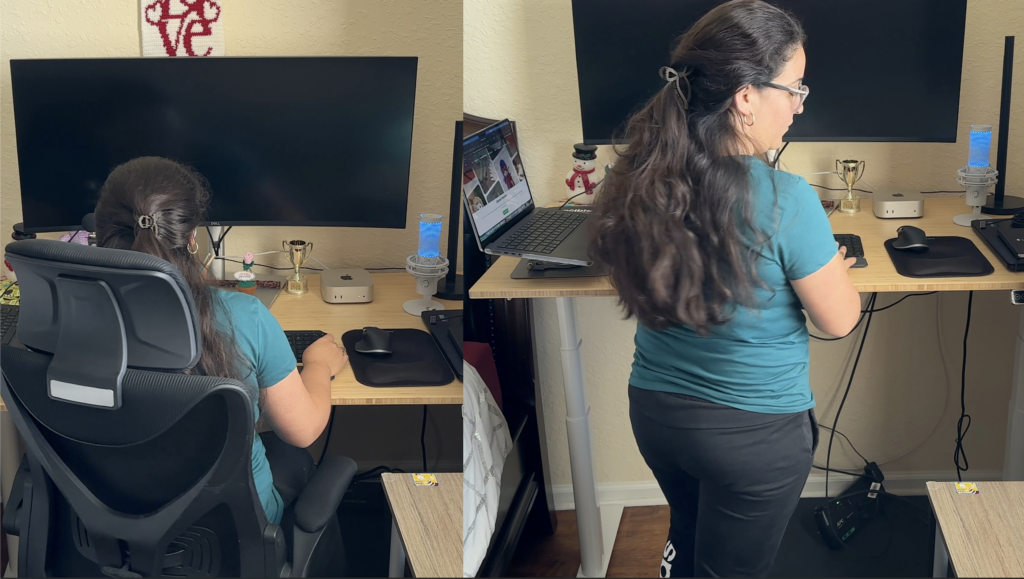 This desk features quiet dual motors, allowing the height to go up and down smoothly and quietly. I can work: